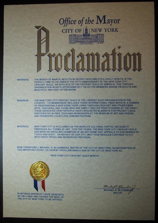 Now, therefore, I, Michael R. Bloomberg, Mayor of the City of New York, in recognition of this important event, do hereby proclaim March 2006 in the city of New York New York City Crochet Guild Month.