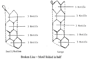 Hexagon MotifsSmall Stocking: 12 Motifs – Only 2 Rnds and 2 Colors. Medium Stocking: 12 Motifs – All 3 Rnds. Large Stocking: 15 Motifs – All 3 Rnds. InstructionsWith Color A, ch 6, join with sl st to form a ring Rnd 1 (Right Side): Ch 3 (counts as 1st dc throughout), 2 dc in ring, ch 2, * 3 dc, ch 2 in ring*. Rep from * to * 4x. Join with sl st to top of ch-3. Fasten off. Rnd 2: With right side facing, join Color B with sl st in any ch 2 sp, ch 2, 2 dc, ch 2, 3 dc in same space as joining, * 3 dc, ch 2, 3 dc in next ch 2 sp*. Rep from * to * 4x. Join with sl st to top of ch-2. Fasten off. Rnd 3: With right side facing, join Color C with sl st in any ch 2 sp, ch 2, 2 dc, ch 2, 3 dc in same sp as joining, (first corner made); 3 dc in sp between next two groups of 3 dc (side); *3 dc, ch 2, 3 dc in next ch 2 space (corner); 3 dc in sp between next two groups of 3 dc*. Rep from * to * 4x, join with sl st to top of ch-2. Fasten off and weave in ends. Connecting MotifsSee drawing below. Using tapestry needle, sew through outer loops only of each motif, carefully matching stitches. Hanger: Join Color A with sl st at top edge of stocking, ch 15, sc in same st, sc in each stitch around outer edge of stocking, placing 2 sc in each point, until reaching ch 15. Sc in each ch of ch-15. Fasten off. | |